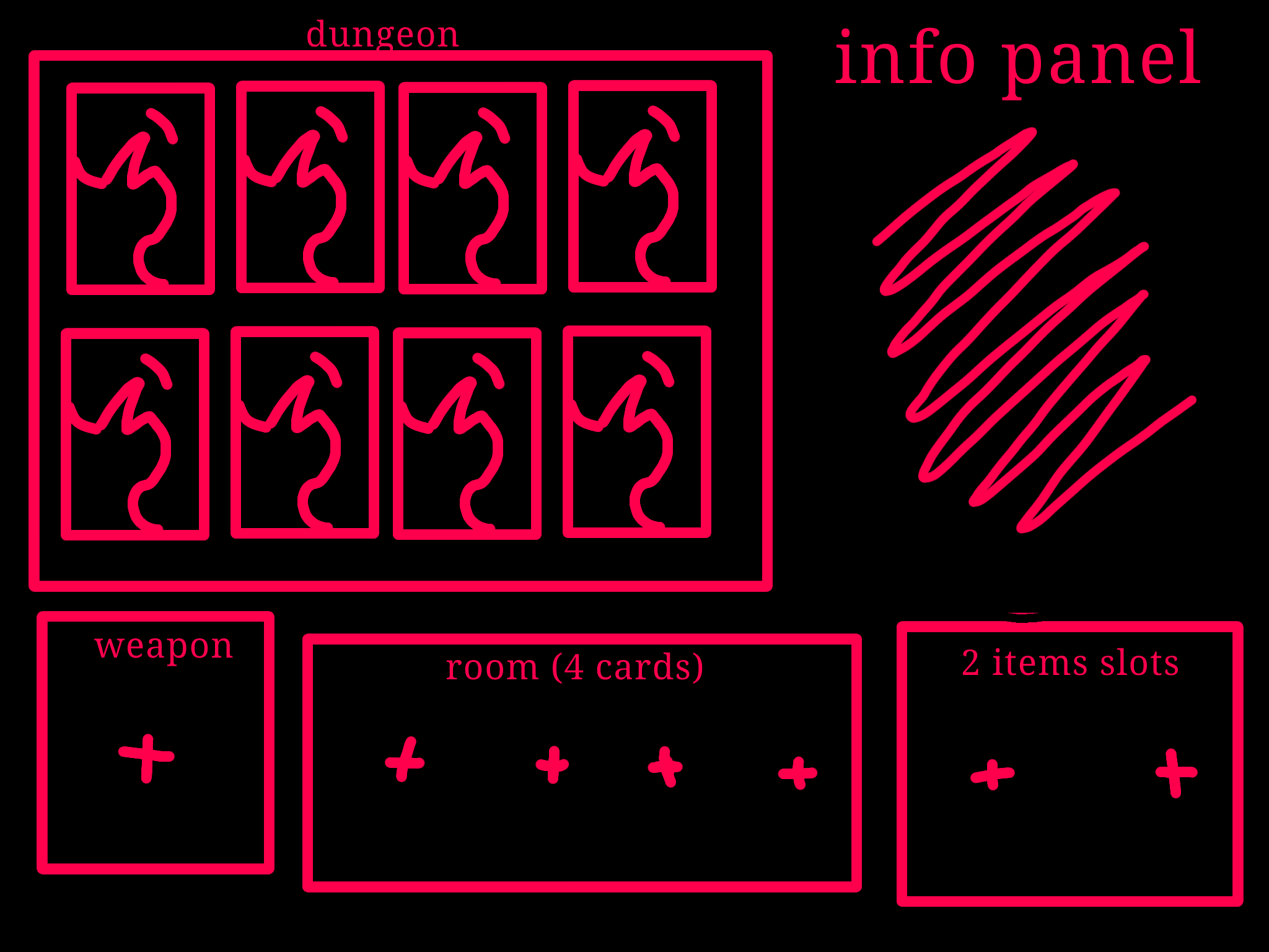 You have your weapon, your inventory, your info panel (sheet of paper) and your dungeon on top of the room you're in. As you accounter different foes thru the dungeon you have the possibility to lose and regain health points. A standard game starts with 25 HP.